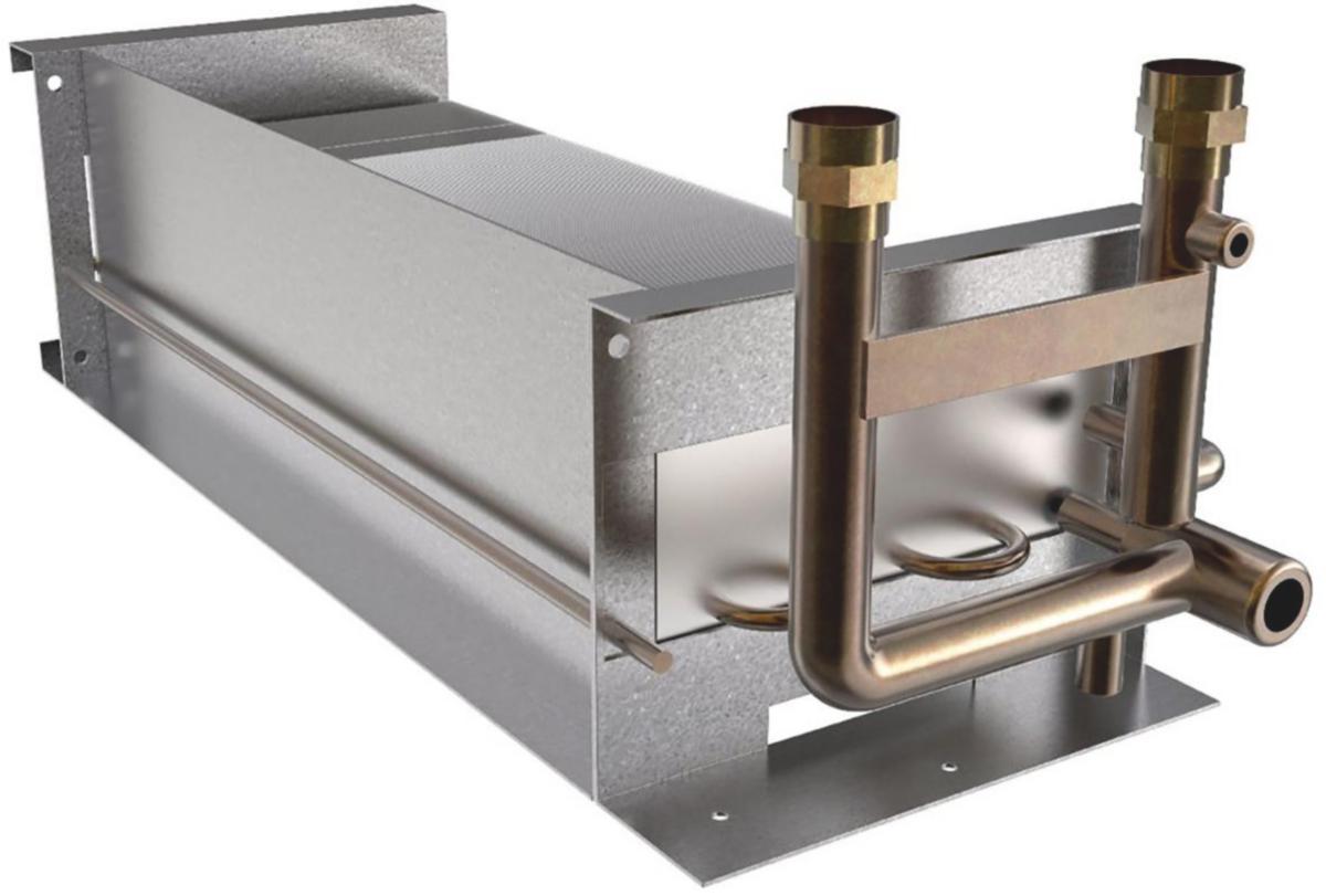 Eftervärmningsbatteri till SAVE VTR 500. Vattenbatteriet ska installeras inuti aggregatet, för att ersätta det existerande elektriska uppvärmningsbatteriet. Maximal drifttemperatur 125 °C. Maximalt drifttryck 0,8 MPa (8 Bar). 2-rads batteri.