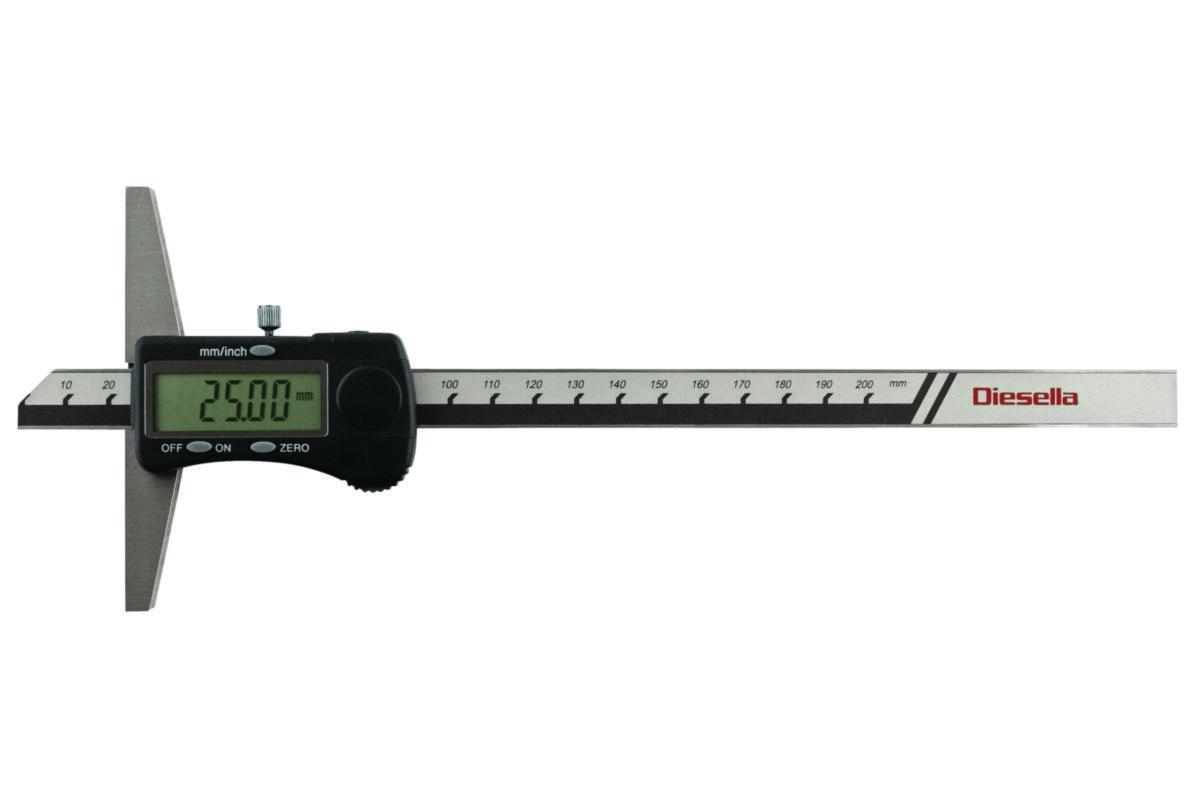 Digital djupmätare med omkopplare från mm till tum och rattläge. Utrustad med mini-USB. Broens längd är 100 mm. Uppfyller kraven enligt DIN 862. Avläsning: 0,01 mm. Batteri: 1,55V (SR44W). Levereras i plastlåda.