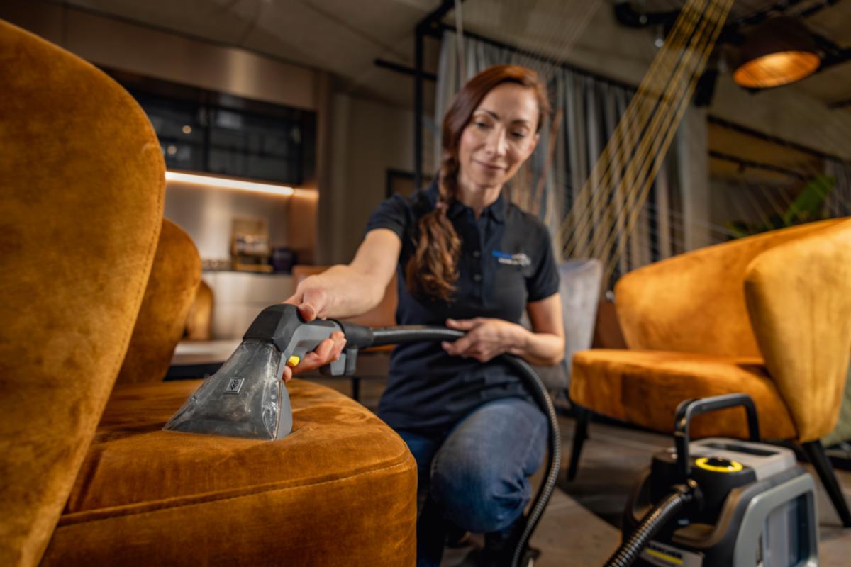 Batteridrivnen Puzzi 2/1 Bp sprutextraktionsmaskin. Denna portabla maskin är idealisk för punktstädning och fläckborttagning och hanterar enkelt både färska och intorkade fläckar på textilier som stoppade stolar, soffor, bilsäten och mycket mer. Puzzi 2/1 Bp avlägsnar snabbt alla fläckar tack vare sin enastående sugförmåga, som dessutom säkerställer korta torktider. Med sin kompakta design, låga vikt och ergonomiska bärhandtag är maskinen enkel att transportera med en hand. För bästa fläckborttagningsresultat pressas rengöringslösningen in djupt i textilfibrerna under tryck och sugs sedan upp igen tillsammans med den upplösta smutsen. Standardutrustning inkluderar klädselmunstycke, sprut-/sugslang, separata behållare för rent och smutsigt vatten samt integrerad förvaring för tillbehör. Levereras utan batteri och laddare.
