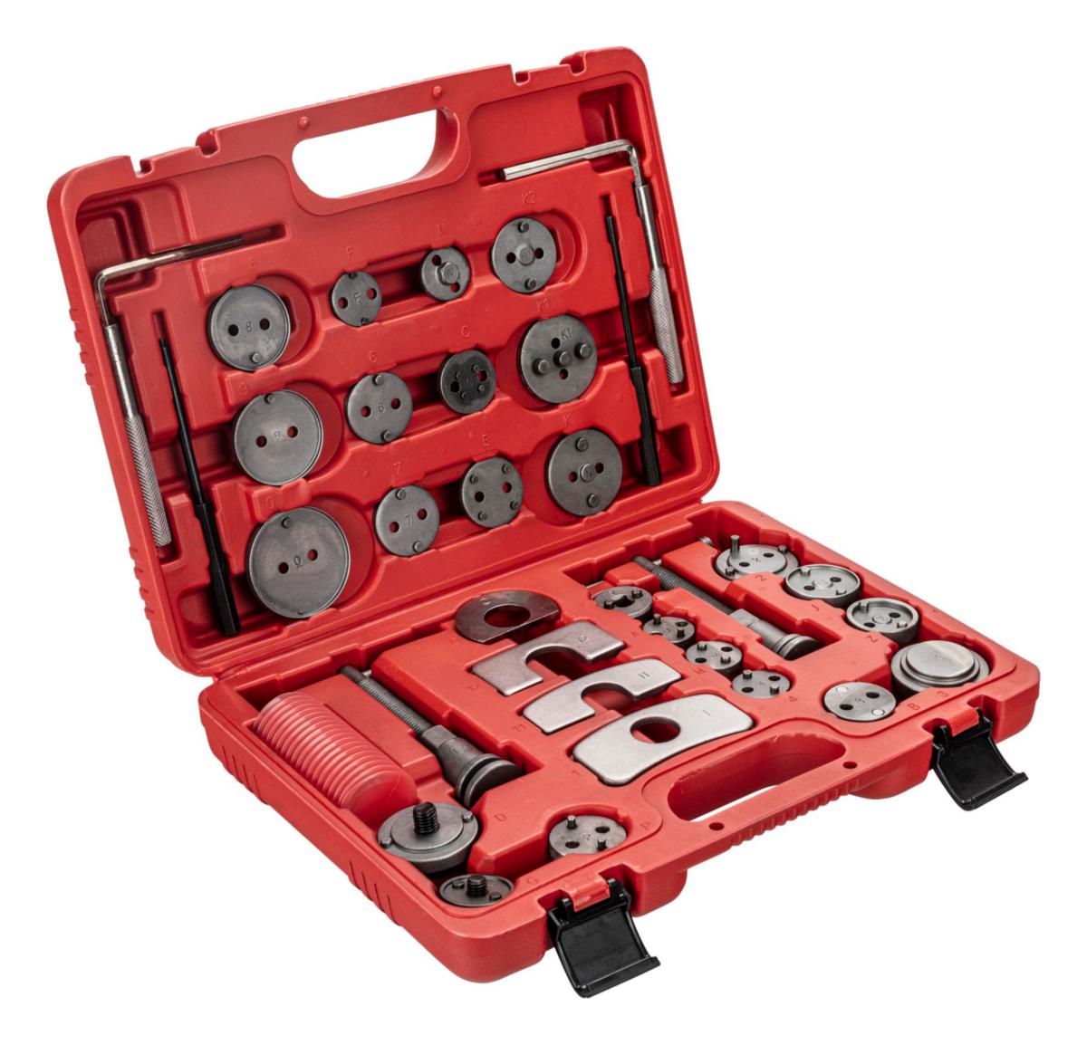 37 delars adapterset, för att skruva/pressa tillbaka vänster och högergängade bromskolvar vid byte av bromsbelägg. Uppsättningen adaptrar är lämpliga för ett brett spektrum av fordon. Den vänstergående är lämplig för Ford, Citroën och Renault applikationer. Precisionen på adapterplattor tillsammans med bromskolvsverktyget hjälper till att förhindra skador på kolvar och tätningar. Detta uppdaterade adapterset passar det senaste utbudet av fordon.
