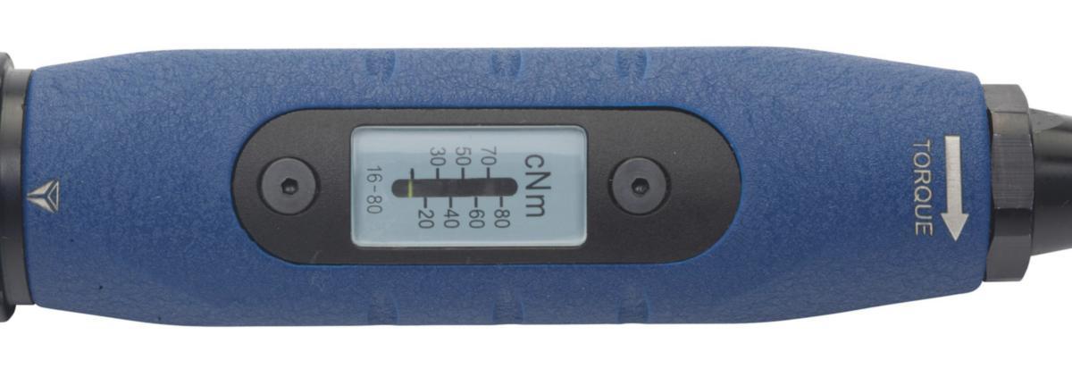 Justerbar ESD-säker momentskruvmejsel med fönsterskala. Kuggar över vid uppnått moment. Klicksystem med signal som känns och hörs. Skala i cN.m. Endast medsols momentmätning, kan användas för att lossa fästanordningar utan att påverka den inre mekanismen. Noggrannhet +/- 6 % medsols. 1/4" sexkant med icke-magnetisk fjäderbelastad bitshållare för att undvika skador på känsliga elektroniska komponenter. Lättläst skala. Halkfritt grepp. Passar för många olika tillämpningar och serietillverkning. Levereras med en fabriksdeklaration om överensstämmelse i enlighet med internationella standarder; ISO 6789/IEC61340-5-1 samt ESD-säker (IEC 61340-5-1 och EN 100015-1).