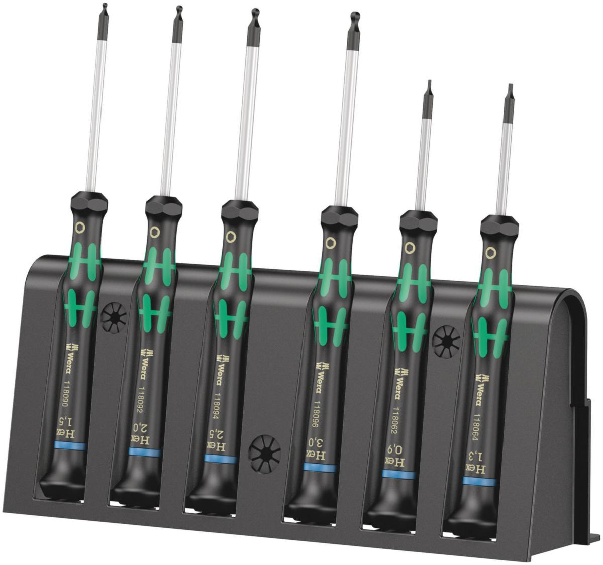 Högkvalitativ Wera Micro-skruvmejselsats för finmekaniska förskruvningar. Kulprofil: På grund av den sfäriska fattningsprofilen går det att luta verktygsaxeln gentemot skruvaxeln, så att man kan skruva "runt hörnet". Genom att stödja handen på den vridbara toppen och tack vare snabbrotationszonen under toppen går det att snurra skruvmejseln blixtsnabbt. Inget tidsödande omtag behövs. Kraftzon med integrerade mjuka partier garanterar överföring av stort lossnings- och åtdragningsmoment. Precisionszon för rätt vridningsvinkel under justeringsarbete. Weras Black Point-spetsar ger precis passform och optimerat korrosionsskydd.