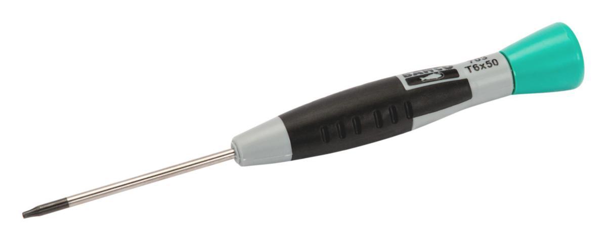 För Torx®-skruvar. Svartoxiderad spets för bättre precision och förkromad klinga som ger korrosionsskydd. Specialutformad skruvmejsel för precisionsarbete, särskilt avsedd för mekaniska och elektroniska arbeten. Tvåkomponentshandtag med mjukt grepp för snabb och bekväm användning. Handtagen är färgkodade och märkta så att det är enkelt att identifiera mejseltyp. Av förkromat högkvalitativt stål med genomhärdad klinga. Greppvänligt tvåkomponentshandtag som gör det enkelt att dra åt skruvarna ordentligt. Roterande huvud gör det enkelt att få spetsen i rätt position och underlättar vid snabbdragning.