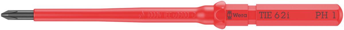 VDE-klinga för Kraftform Kompakt handtags-/växelklingsystem. Blixtsnabbt byte av klingan utan specialverktyg. Enskilt kontrollerade verktyg enligt IEC 60900. Enskild kontroll vid 10 000 V för säkert arbete vid den tillåtna spänningen på 1 000 V. Wera Black Point-spetsen ger exakt passning och optimerat korrosionsskydd. Med verktygsväljare "Take it easy": färgkodning efter profiler och lasergraverad storleksmärkning. Det sexkantiga rullstoppet hindrar klingan från att rulla iväg.