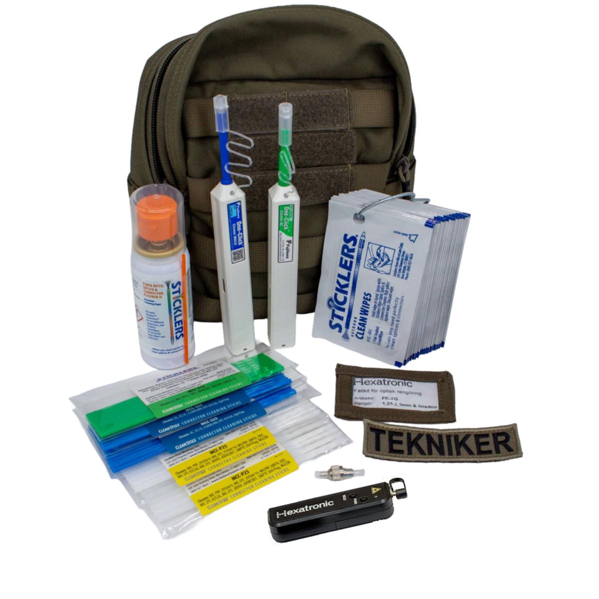 Grundläggande utrustning för underhåll och felsökning av fiberoptiska nätverk och taktisk fältkommunikation. Utrustningen levereras i en mångsidig väska som kan bäras över axeln med en rem och fästas på bältet eller på ryggsäckar.