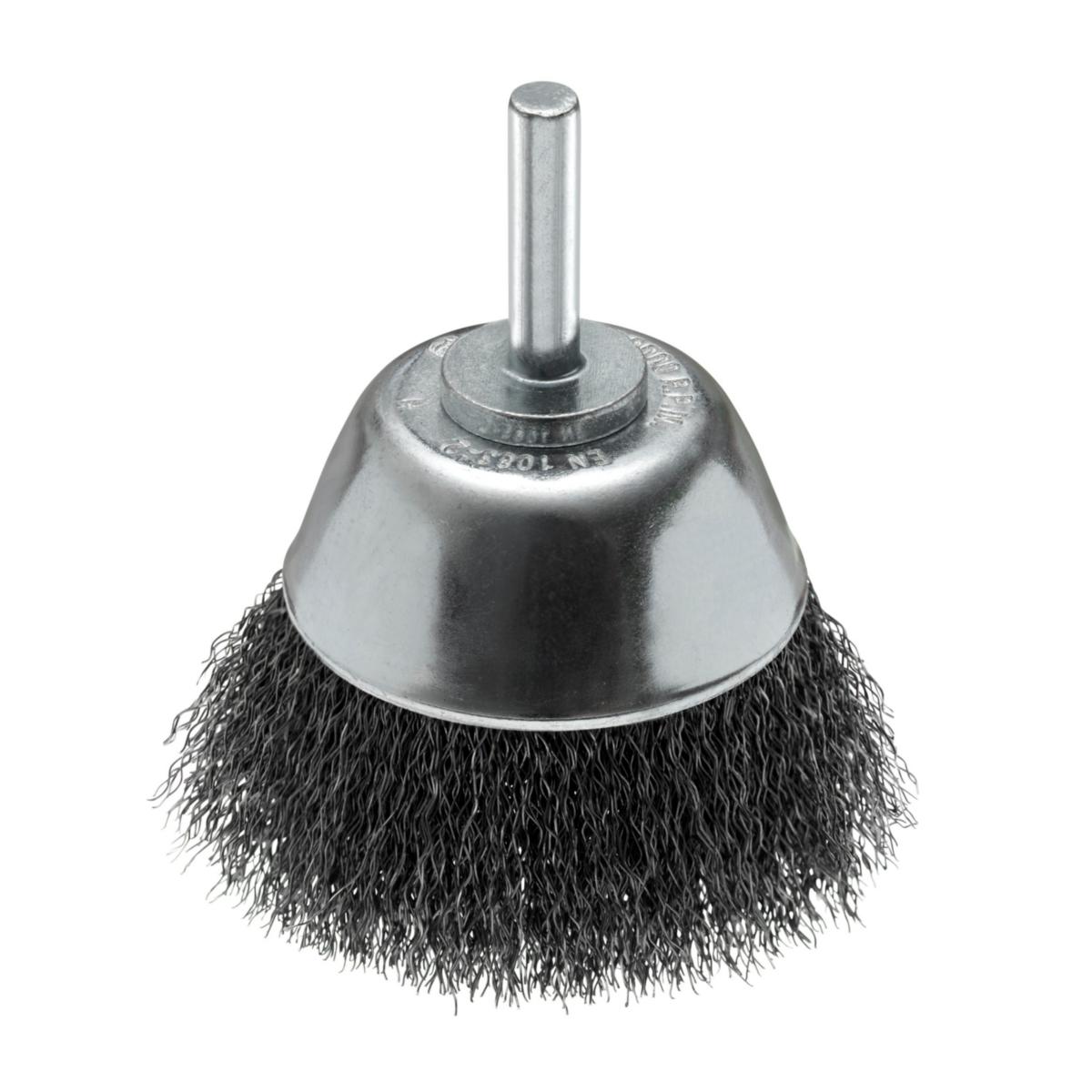 Med krusad tråd för lättare rengöringsarbeten och ytbehandlingar. Den är också lämplig för borttagning av beläggningar och rost samt rengöring av ytskikt. Med 6mm tapp för fastsättning i t.ex. borrmaskin. Krusad ståltråd.