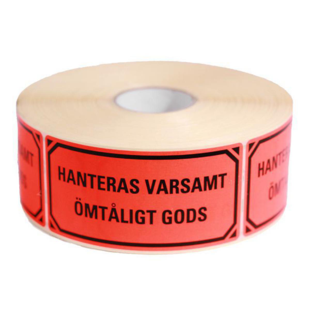 Märk dina lådor, påsar etc med denna tydliga etiketter på rulle för varsam hantering av gods! Flourescerande självhäftande etikett med svart tryck.