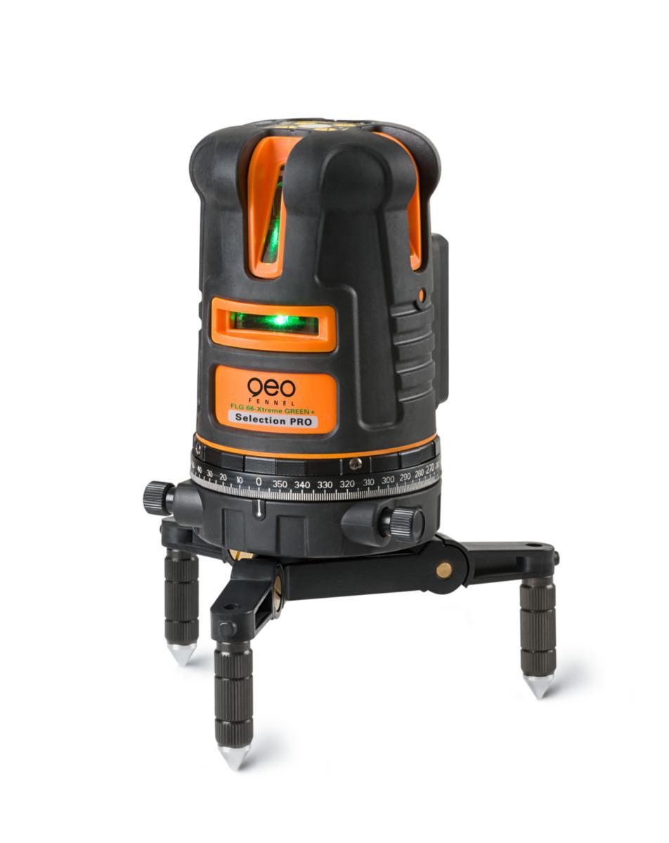 Selection PRO GREENLASER-teknologin från GeoFennel med bra skärpa och smal laserlinje på upp till 40 m. Denna nya generation av korslaser klarar ogynnsamma förhållanden och tuff hantering på byggarbetsplatser. Stabila interna komponenter säkerställer funktion och noggrannhet. Perfekt tätning säkerställer damm- och vattenskydd enligt IP 65. FLG 66-Xtreme Green + SP använder den senaste Li-Ion batteriteknologin.