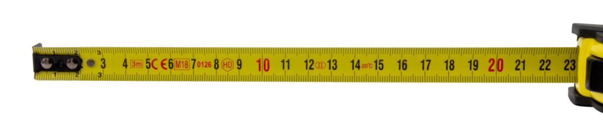 Robusta prof. måttband med powerlock. Med gula måttband, svart MM -skala och röda siffror var tionde cm. Huset är gummibelagd för det extra skyddet. Tjocklek 0,14 mm. Klass II. Levererad inkl. kraftfullt metallbältesklipp och bärrem.