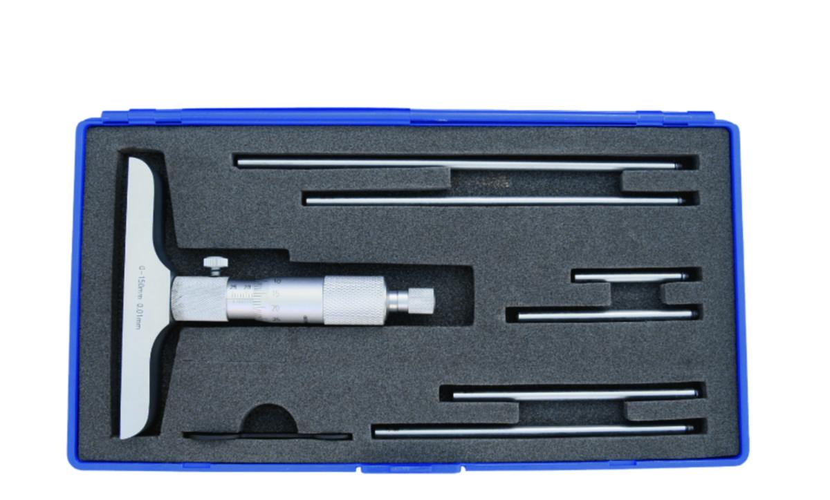 Matförkromad mikrometerskruv. Mätområde 0-150 mm. För att uppnå olika mätdjup kan mätnålen bytas ut - dessa varierar med 25 mm. Satsen är inkl. 6 utbytbara mätnålar: 1 st. 0-25 mm, 1 st. 75-100 mm, 1 st. 25-50 mm, 1 st. 100-125 mm, 1 st. 50-75 mm och 1 st. 125-150 mm. Fullhärdad och slipad spindel och brygga i härdat verktygsstål med finmalt mätyta. Mättrumma med rena graverade och svartmarkerade skiljelinjer och siffror. DIN 863/1. Avläsning: 0,01 mm. Levereras i en plastlåda.
