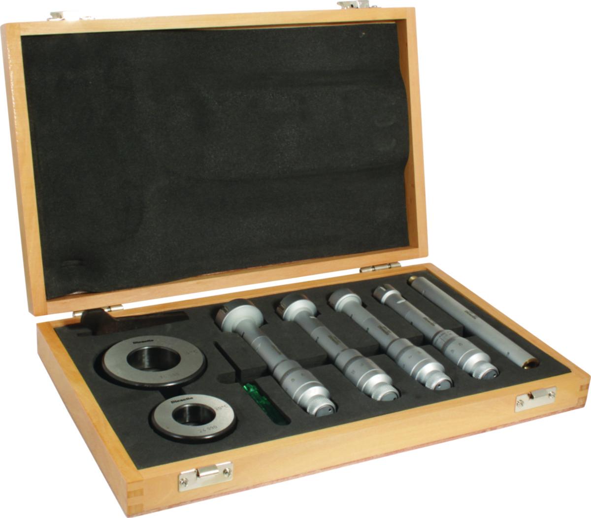 3-punkts mikrometer i rostfritt stål med mätområde 6-100 mm med matt förkromad design som ger bländningsfri avläsning. Mätytorna är belagda med hårdmetall och mättrumman har en tydlig svart skala och spärr. Kan användas för bottenhål. Avläsning: 0,05 mm. Levereras i trälåda inkl. kontrollring.