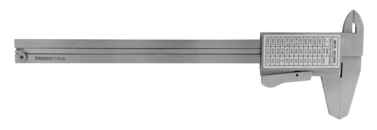 Högkvalitäts analog skjutmått med autolås och integrerad djupmått. Ett bramätverktyg för livslångt bruk. Upplösning: 0,05 mm. Noggrannhet: +/- 0,03 mm. Mattförkromade skala och nonius. Levereras med konstläder väska ock kalibreringscertifikat.