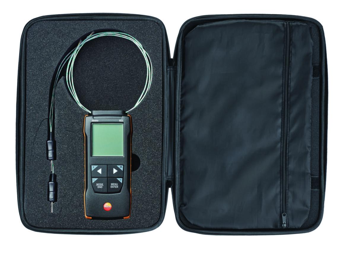 Ingår i leverans: testo 922 – 2-kanals temperaturmätare TC Typ K med app-anslutning och ljudlarm, Transportväska, 2 st trådgivare typ K, Kalibreringsprotokoll, 3 AA-batterier och Fabriksprotokoll: utfärdas på fabriken efter en kontroll av att produkten fungerar och uppfyller angiven mätnoggrannhet.