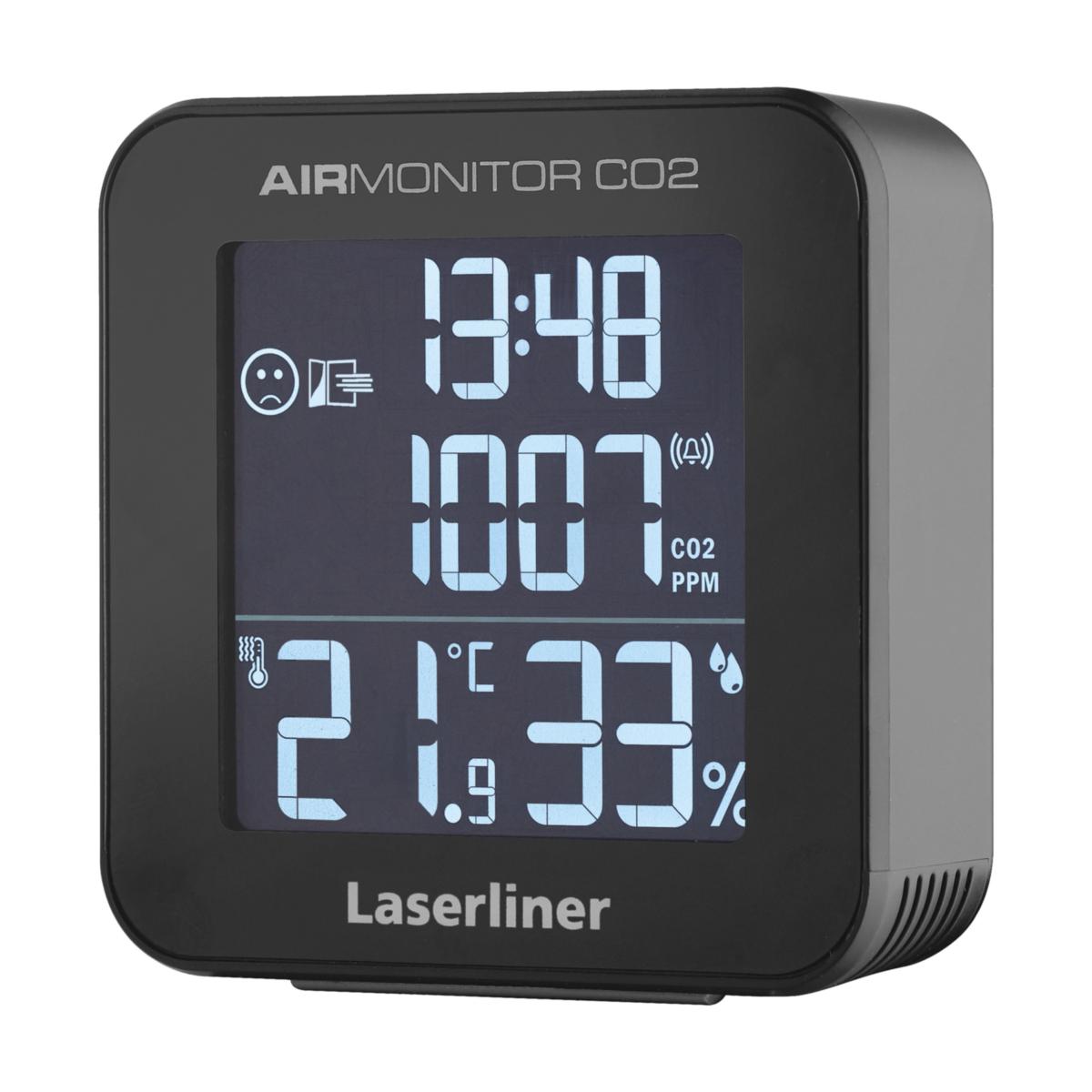 CO₂-mätanordning för inspelning och bedömning av koldioxidhalten med ventilationsrekommendation och visning av tid, temperatur och luftfuktighet. Mätområde: Koldioxidkoncentration (CO₂), Luftfuktighet, Omgivningstemperatur. Funktioner: Koldioxidlarm (CO₂), Koldioxidmätare (CO₂), Realtidsklocka. Mätområde omgivningstemperatur: -9,9°C till 50°C. Noggrannhet omgivningstemperatur: ± 1°C. Mätområde luftfuktighet (Relativ): 0% till 100%. Noggrannhet(absolut): ± 3% (30% till 70%). Luftfuktighet(Relativ): ± 5% (0% till 30% & 70% till 100%). Mätområde Koldioxid(CO₂):400 till 9999 ppm. Precision koldioxid(CO₂): ± 50 ppm. Sensortyp: NDIR CO₂. Strömförsörjning: Nätadapter 5V/DC / 1A. Måttenhet: % RH (relativ luftfuktighet), °C (Celsius), ppm. Mått: 90 x 91 x 33mm.