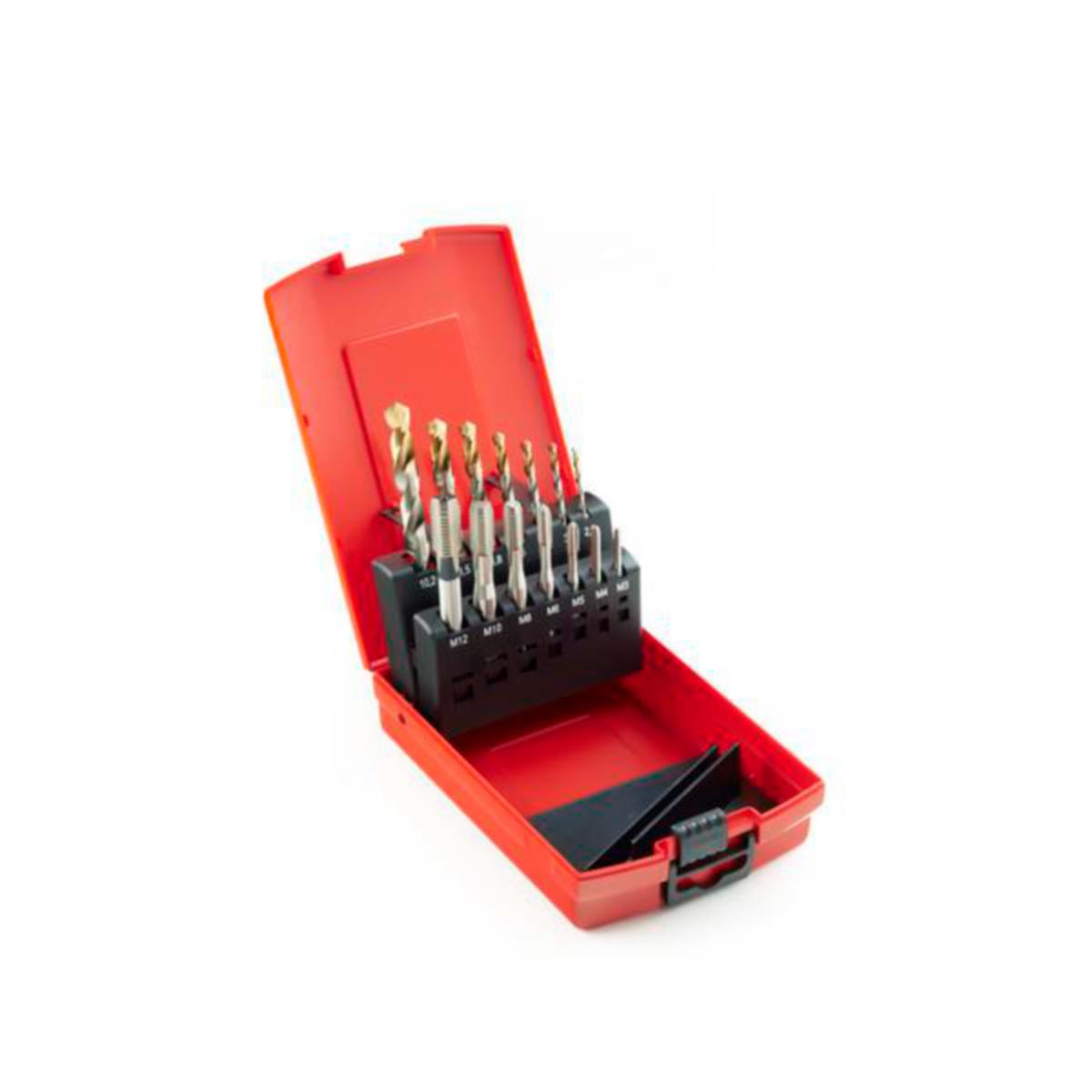 Kombinerad borr och handgängtappssats Dormer M3-M12 med ISO-tappar. Innehåller rakspåriga tappar typ E500 gradtapp (fas nr3) M3 - M12 och gängborr A002, diam. 2,5-3,3-4,2-5,0-6,8-8,5 och 10,2.