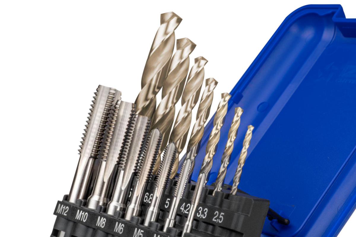 M-grovgänga. Handgängsats med rakspåriga gängtappar 3039 typ C (nr3), M3-M4-M5-M6-M8-M10-M12. Snabbstål. ISO 529. Spiralborrar 1015, 2,5-3,3-4,2-5,0-6,8-8,5-10,2 mm. Snabbstål med Zirkonium-belagd spets ger lägre friktion och längre livslängd. Med korsspets för noggrann centrering. Spetsvinkel 118°.