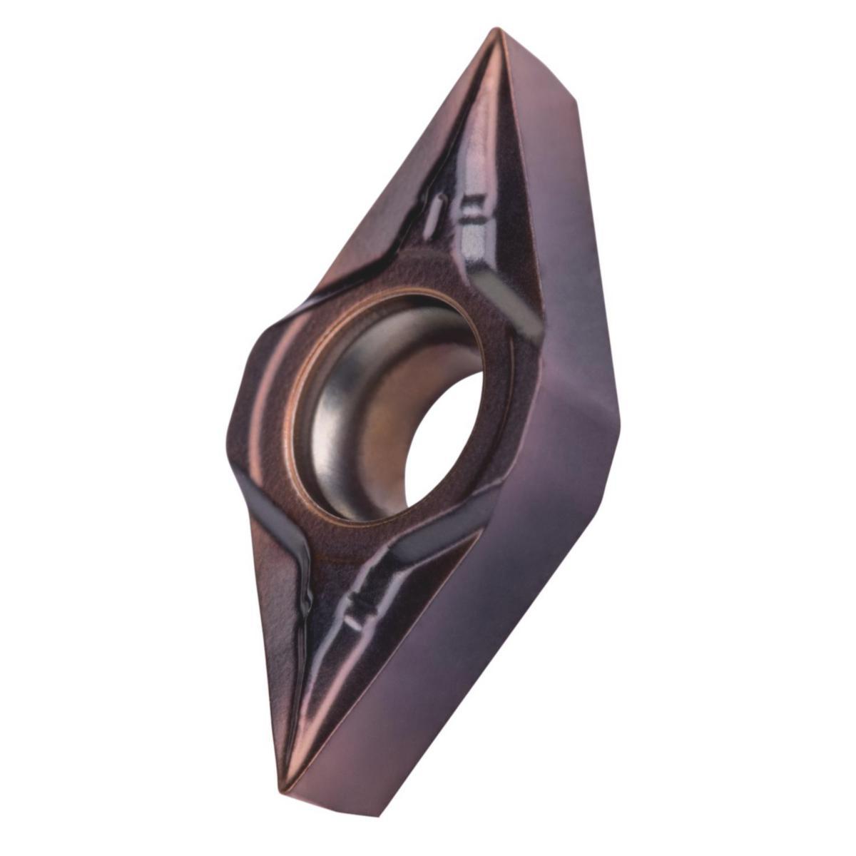 Enkelsidigt positivt svarvskär, 55° romb med 7° släppning, inskriven cirkel med diametern 6.35/9.525 mm, 2.38/3.97 mm tjock, 0.2/0.4/0.8 mm nosradie, indexeringsnoggrannhet enligt ISO-toleransklass-M, spånbrytare UR med rundad egg, i sort T8430, en PVD belagd finkornig WC-Co hårdmetall inom ISO-område P25-P40, för fin till tung bearbetning av stål.