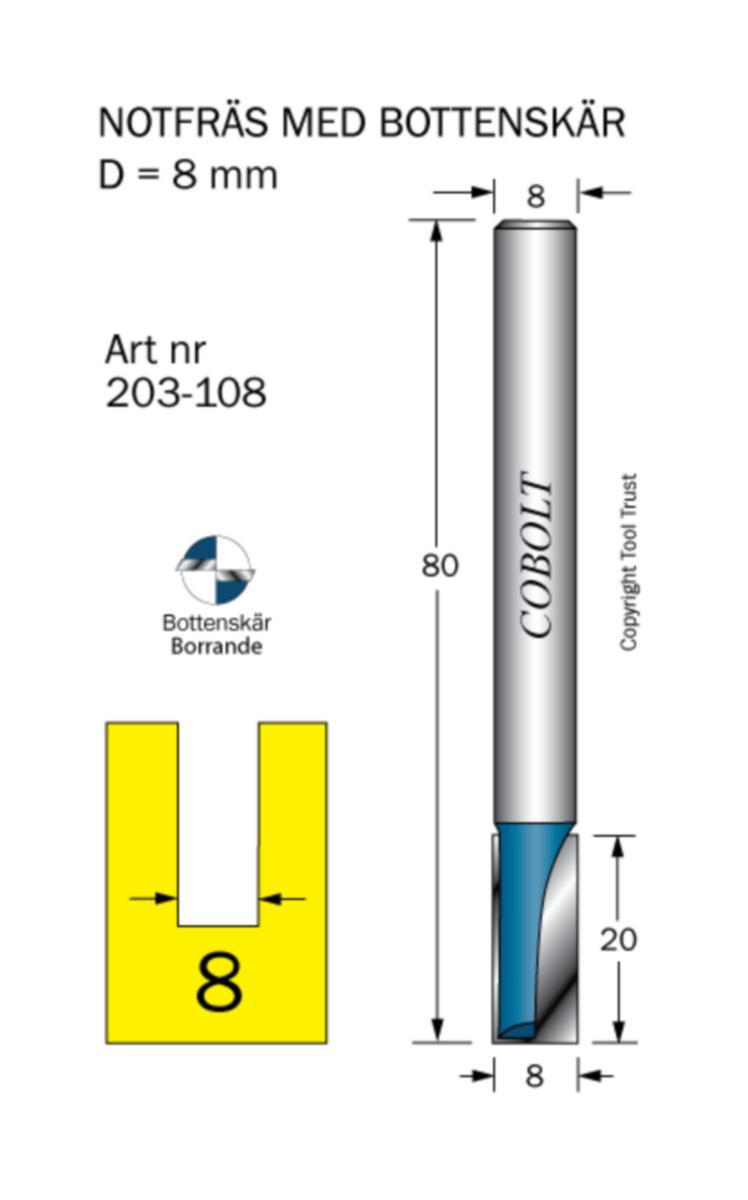 Notfräs med bottenskär. Borrar effektivt rakt ner i materialet även i hårda träslag och laminat. För att fräsa notspår, falsspår, spontfräsning och borrning i all slags trä, laminat, plast m.m. Notfräsar med skärdiameter 6 mm eller mindre har massiv hårdmetallspets. Art nr 820463, 820464 och 820465 utan bottenskär.