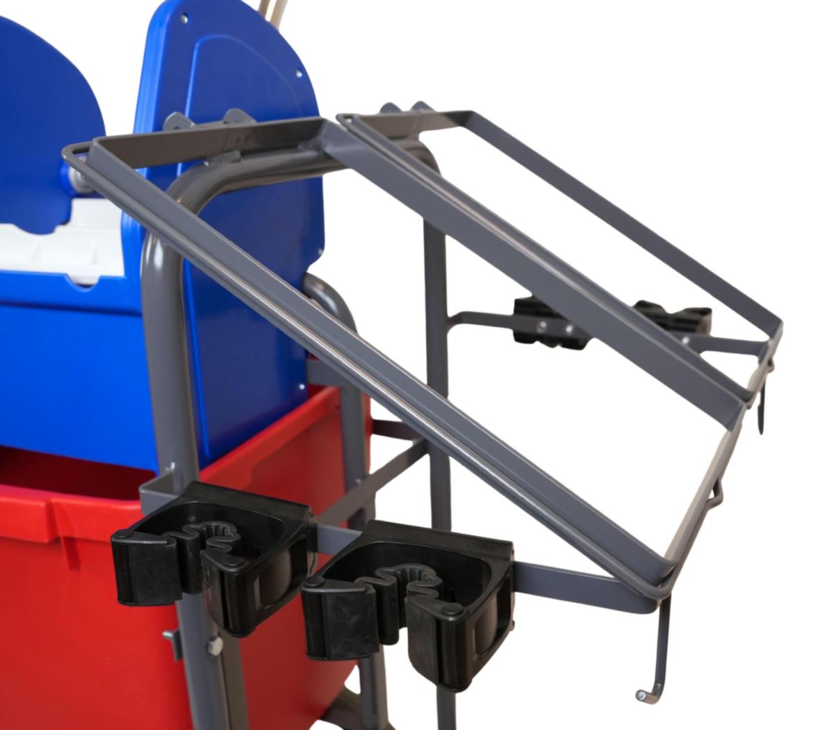 Städvagn anpassad för fastighetsstädning med stora punkteringsfria bromsbara däck på 400 mm bak och 150 mm hjul fram. Med svabbpress i plast, hink 25 l, 1 st korg, 2 st sopsäckshållare, 4 st skafthållare och ergonomiska och greppvänliga handtag. L 900 mm, B 570, H 1040 mm. En perfekt fastighetsvagn för de som har lite längre till sin tvättstuga. Två av skafthållarna är anpassade till att enkelt kunna fästa kvastar och golvsopborstar.