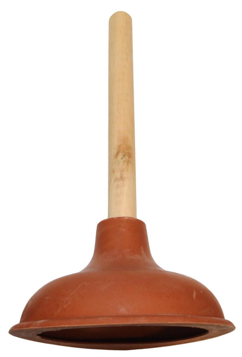 Vaskränsare med sugklocka av gummi och skaft av trä.