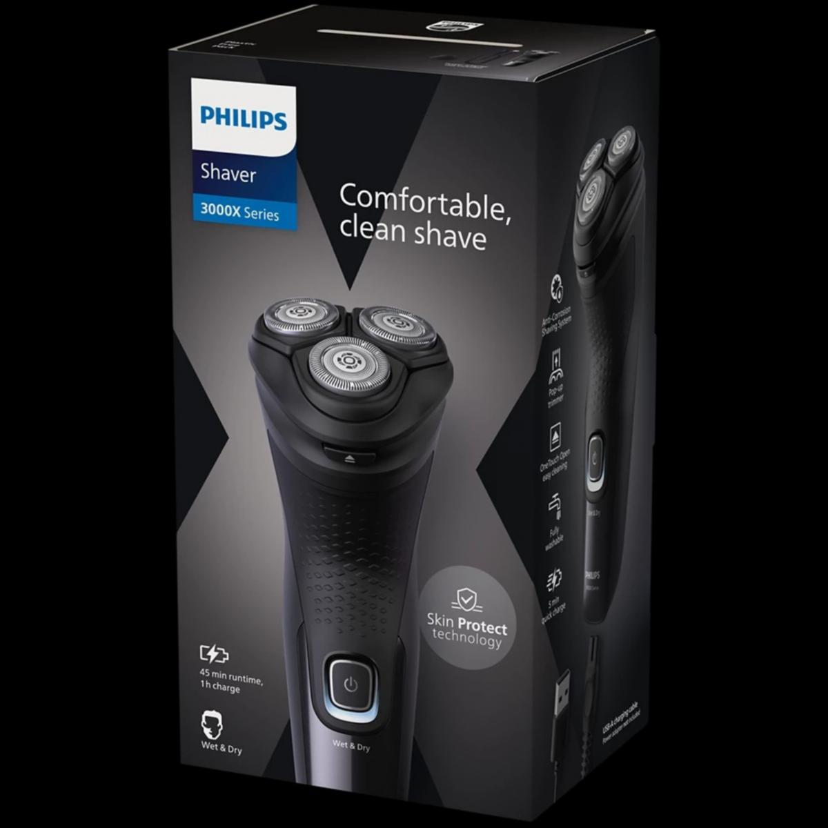 Philips rakapparat för våt- och torrakning i 3000X-serien ger dig en behaglig och nära rakning. 27 självslipande PowerCut-blad samt en uppfällbar trimsax gör rakapparaten enkel att använda och är alltid tillförlitlig. Rörliga rakhuvuden som kan böjas i fyra riktningar för att hålla jämn kontakt mot huden och skydda den mot skärsår.