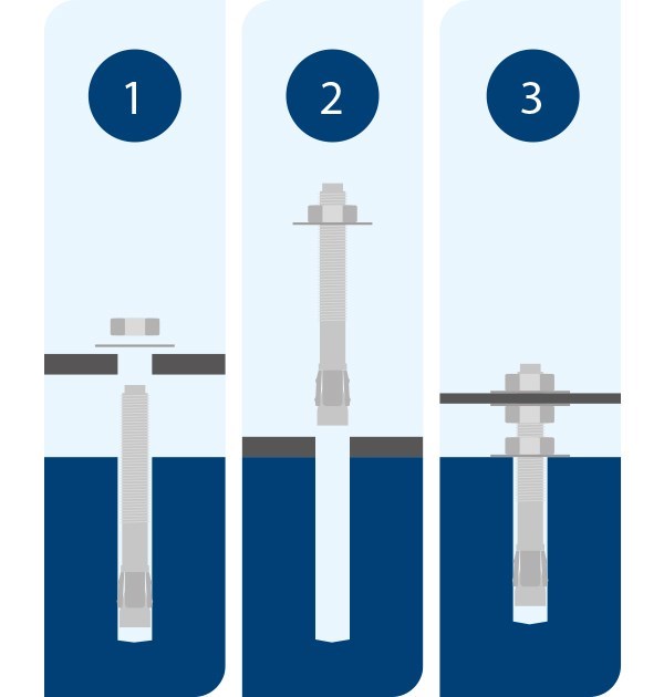 Grundregeln är att ju djupare ankaret monteras desto bättre utnyttjas grundmaterialets hållfasthetsegenskaper vilket ger en starkare infästning. Följ uppgifterna i grundmaterialets om maximitjockleken tfix och monteringsdjupet hnom.