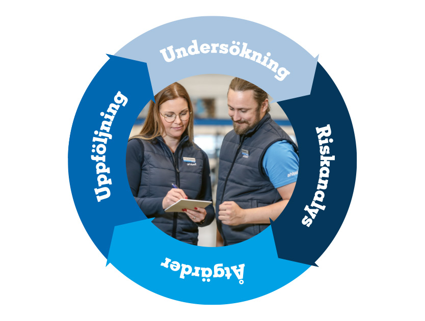 Skyddsutrustningen ska självklart också användas på ett korrekt sätt. Därför genomför vi även utbildningar kring och utprovning av utrustningen, och medverkar vid implementering samt upprättande av rutiner. Sist men inte minst gör vi en uppföljning, för att säkerställa att allting fungerar och används som det ska. Läs mer om hela konceptet Hälsa & Säkerhet här.