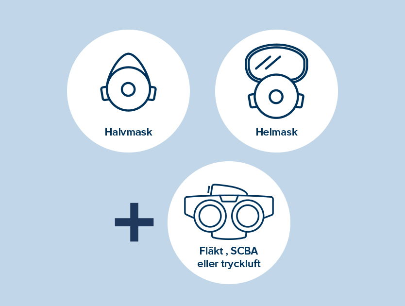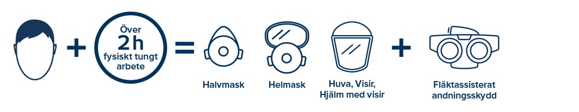 Är du renrakad och arbetar långa eller fysiskt tunga arbetspass rekommenderas att du använder ett fläktassisterat andningsskydd.